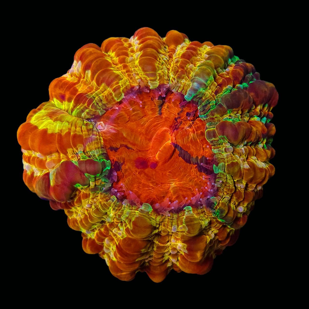 Radiant and commanding, the Obsidian Sun Acantophyllia is a true centerpiece for any reef. Its thick, fleshy polyps glow with a molten orange core, edged with flashes of neon yellow and electric green, giving it the appearance of a sun forged from obsidian. Each fold and ridge adds depth and texture, creating a living sculpture that draws the eye from every angle.