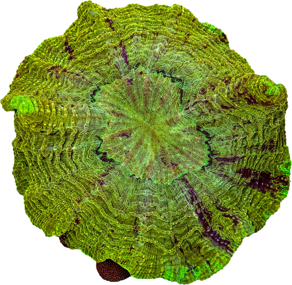 Acanthophyllia deshayesiana, known as the Acanthophyllia, is a true showpiece coral revered for its cosmic coloration and immense, fleshy form. This ultra-grade specimen displays swirling nebula-like patterns in vivid hues of crimson, teal, gold, and violet that shift and glow under actinic and blue-spectrum lighting. With a single, massive polyp that expands dramatically when healthy, the Acanthophyllia commands immediate attention as the centerpiece of any LPS or collector reef display. Its hardiness, combined with its visual brilliance, makes it one of the most sought-after corals in the modern reef trade.