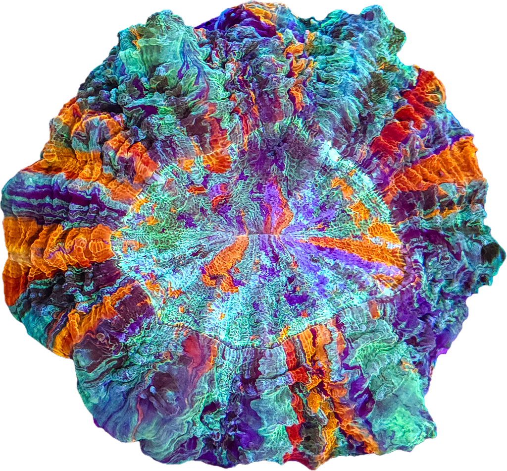 Acanthophyllia deshayesiana, known as the Acanthophyllia, is a true showpiece coral revered for its cosmic coloration and immense, fleshy form. This ultra-grade specimen displays swirling nebula-like patterns in vivid hues of crimson, teal, gold, and violet that shift and glow under actinic and blue-spectrum lighting. With a single, massive polyp that expands dramatically when healthy, the Acanthophyllia commands immediate attention as the centerpiece of any LPS or collector reef display. Its hardiness, combined with its visual brilliance, makes it one of the most sought-after corals in the modern reef trade.