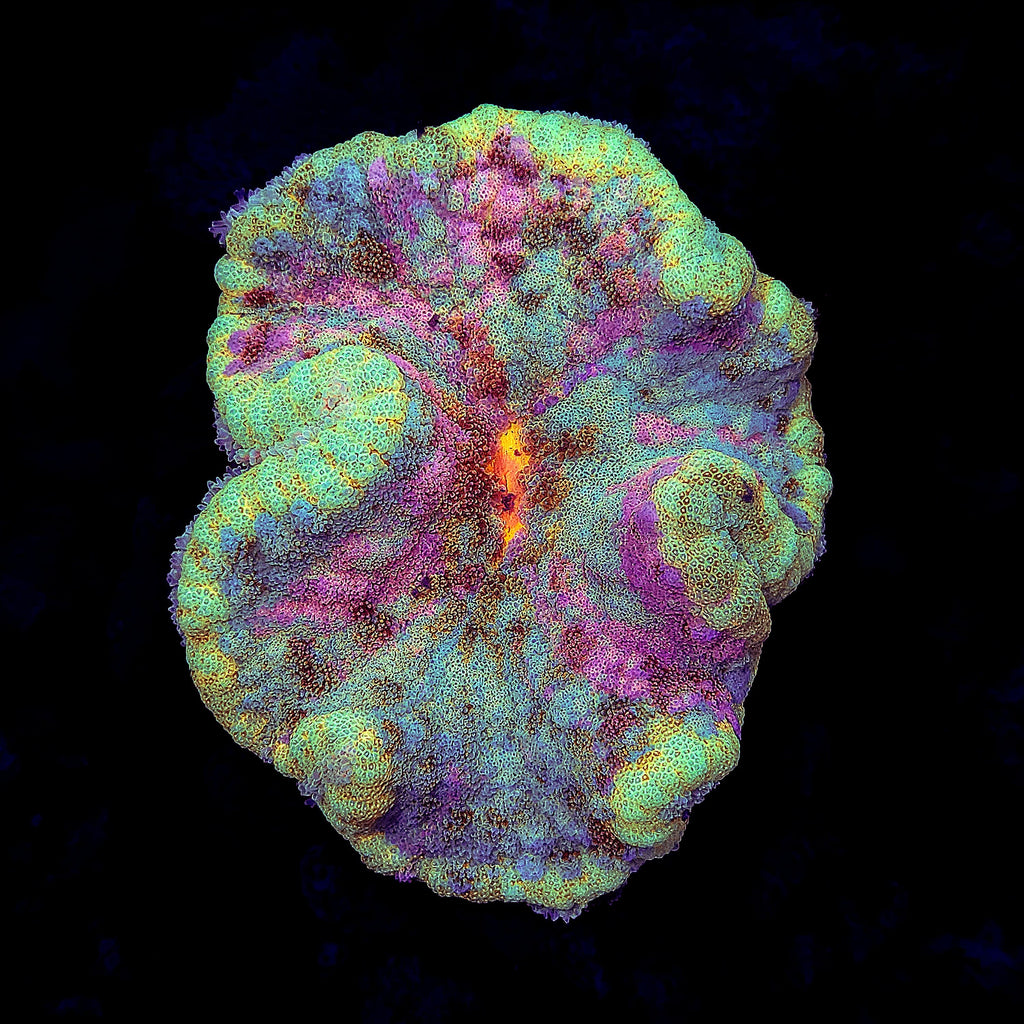 Stichodactyla tapetum, known as the Pizza Anemone, is an exclusive Reeflections Farm strain of the Maxi Mini Carpet Anemone. This ultra-premium morph is completely unique, with color distribution and pattern intensity varying naturally in each anemone, making it one of the most visually explosive and collectible anemones in the hobby. Despite its small size, it delivers immense visual impact, glowing vividly under blue-spectrum lighting.