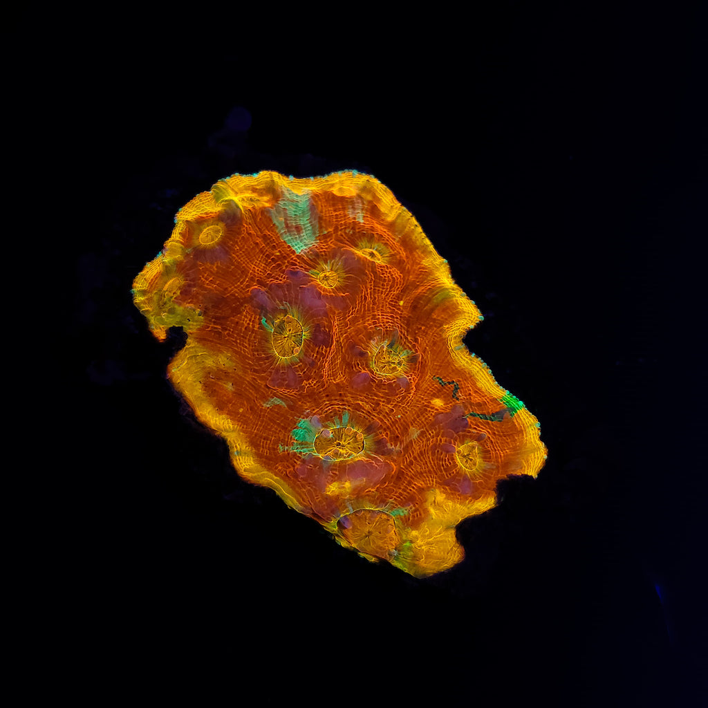 The Chalice Coral is a collective name for several closely related LPS genera, including Echinophyllia, Oxypora, and Mycedium. Renowned for their vivid, often iridescent coloration and dramatic growth forms, Chalice corals are among the most visually striking additions to reef aquariums. Their surfaces display intricate ridges, eyes, and swirling patterns in colors ranging from neon green and hot pink to rainbow blends. Found on shaded reef slopes and overhangs, these corals thrive under gentle flow and subdued lighting, where their fluorescence and contrast truly come alive.