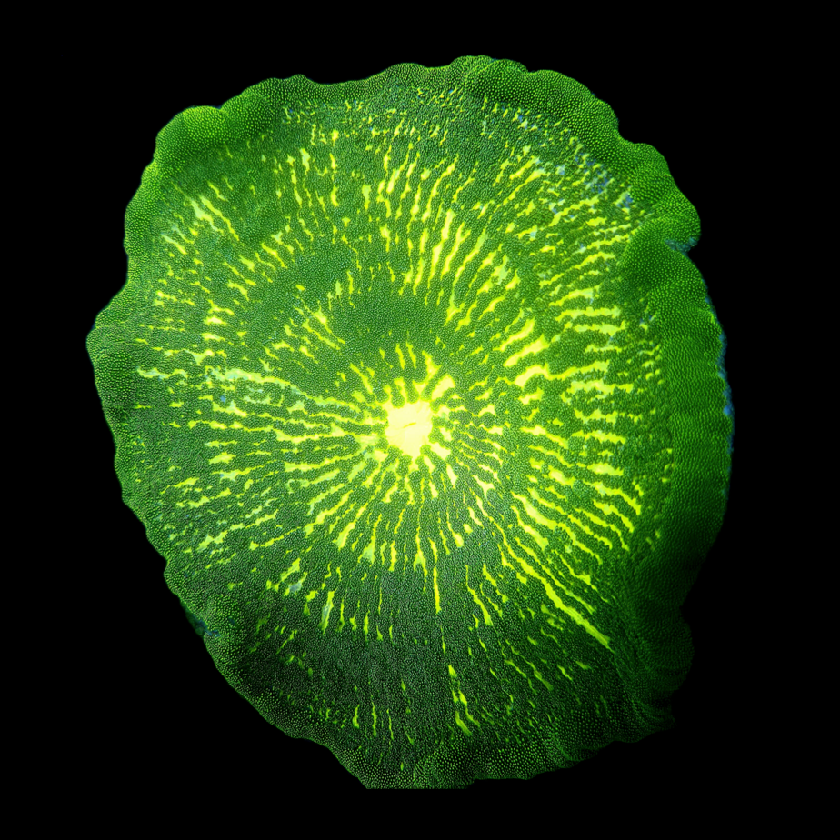 Stichodactyla tapetum, known as the RF Nuclear Splatter Pizza Anemone, is an exclusive Reeflections Farm aquacultured strain of the Maxi Mini Carpet Anemone. This ultra-premium morph displays an electrifying mix of neon green, hot pink, and deep indigo tones, with atomic yellow “splatter” patterns radiating across its dense oral disc. Each specimen is completely unique, with color distribution and pattern intensity varying naturally, making it one of the most visually explosive and collectible anemones in the hobby. Despite its small size, it delivers immense visual impact, glowing vividly under blue-spectrum lighting.