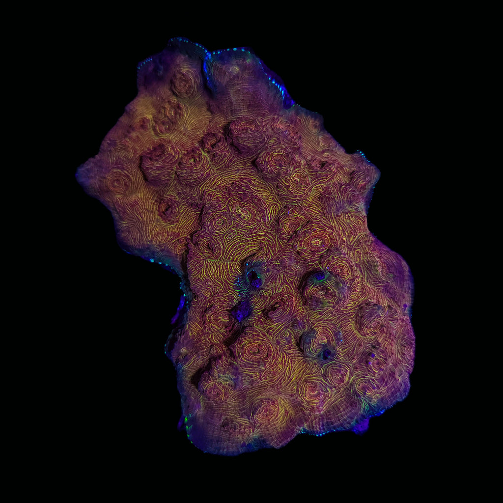The Chalice Coral is a collective name for several closely related LPS genera, including Echinophyllia, Oxypora, and Mycedium. Renowned for their vivid, often iridescent coloration and dramatic growth forms, Chalice corals are among the most visually striking additions to reef aquariums. Their surfaces display intricate ridges, eyes, and swirling patterns in colors ranging from neon green and hot pink to rainbow blends. Found on shaded reef slopes and overhangs, these corals thrive under gentle flow and subdued lighting, where their fluorescence and contrast truly come alive.