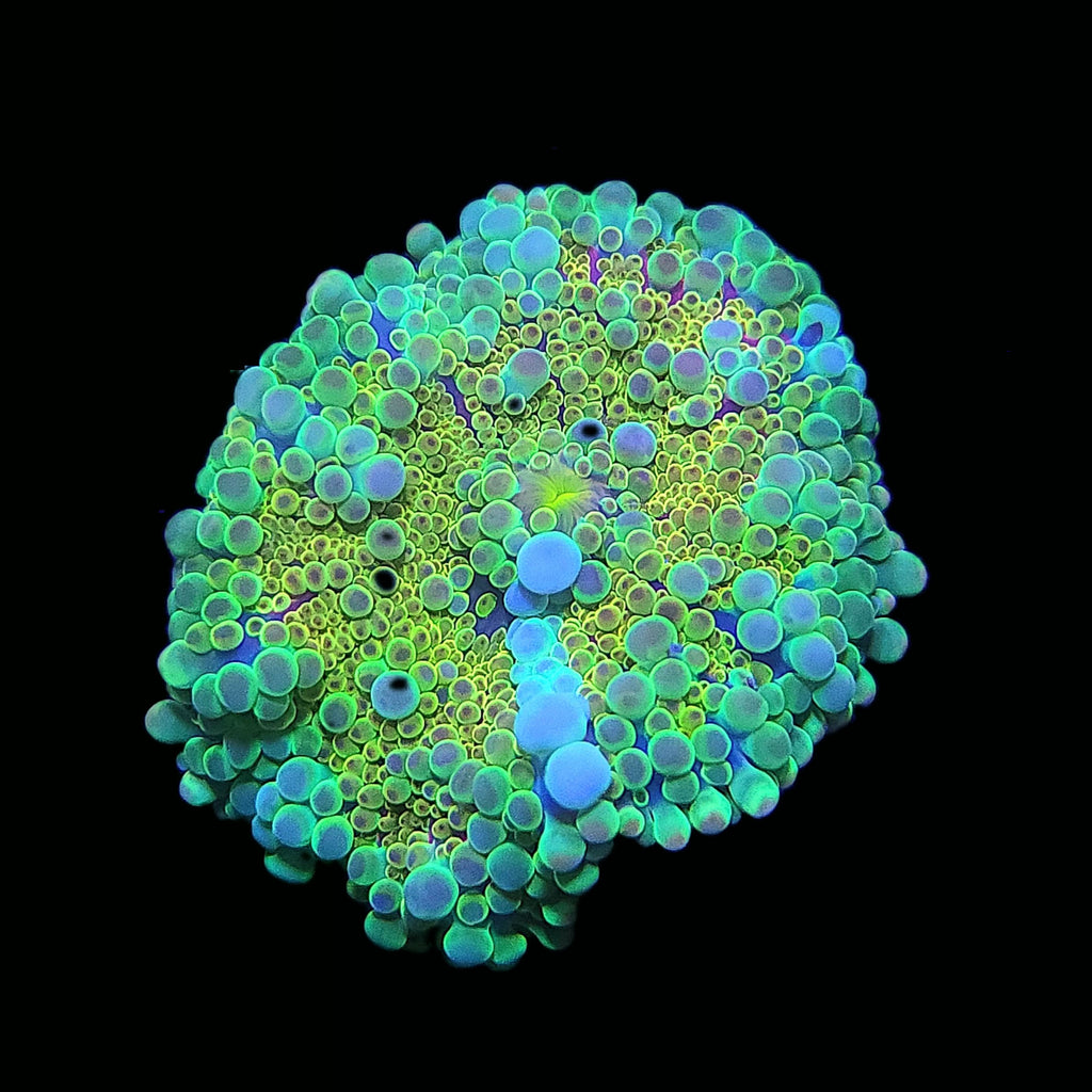Ricordea yuma, commonly known as the Yuma, is a striking and highly sought-after mushroom coral prized for its vivid coloration and textured polyp structure. Native to the Indo-Pacific, this species is characterized by its bubble-like surface and iridescent hues of orange, pink, green, and blue that shimmer under actinic lighting. Each Yuma displays a unique color pattern, often with contrasting oral discs and tentacle rings, making it a collector’s favorite for both mixed reefs and dedicated mushroom gardens.