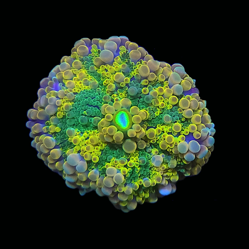 Ricordea yuma, commonly known as the Yuma, is a striking and highly sought-after mushroom coral prized for its vivid coloration and textured polyp structure. Native to the Indo-Pacific, this species is characterized by its bubble-like surface and iridescent hues of orange, pink, green, and blue that shimmer under actinic lighting. Each Yuma displays a unique color pattern, often with contrasting oral discs and tentacle rings, making it a collector’s favorite for both mixed reefs and dedicated mushroom gardens.