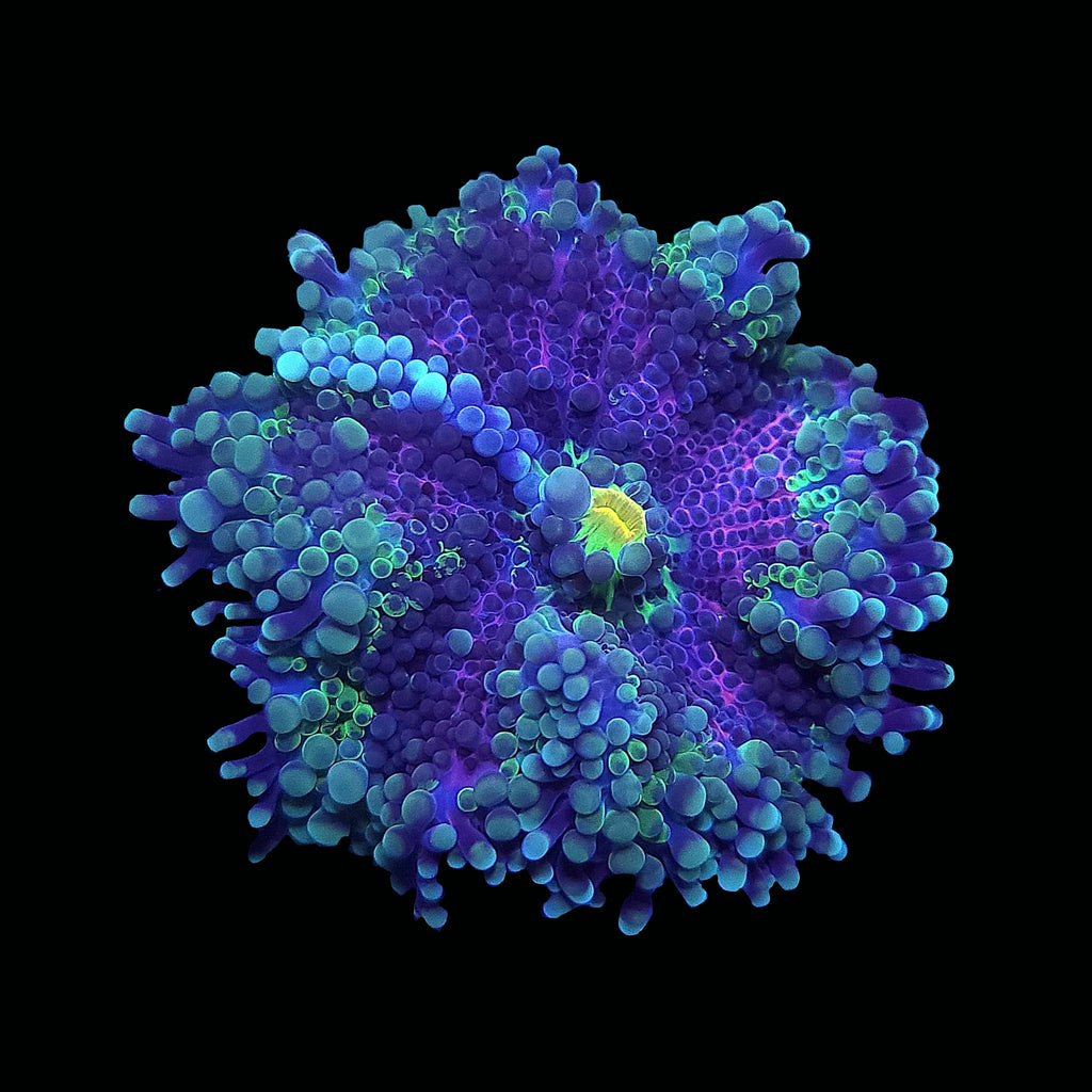 Ricordea yuma, commonly known as the Yuma, is a striking and highly sought-after mushroom coral prized for its vivid coloration and textured polyp structure. Native to the Indo-Pacific, this species is characterized by its bubble-like surface and iridescent hues of orange, pink, green, and blue that shimmer under actinic lighting. Each Yuma displays a unique color pattern, often with contrasting oral discs and tentacle rings, making it a collector’s favorite for both mixed reefs and dedicated mushroom gardens.