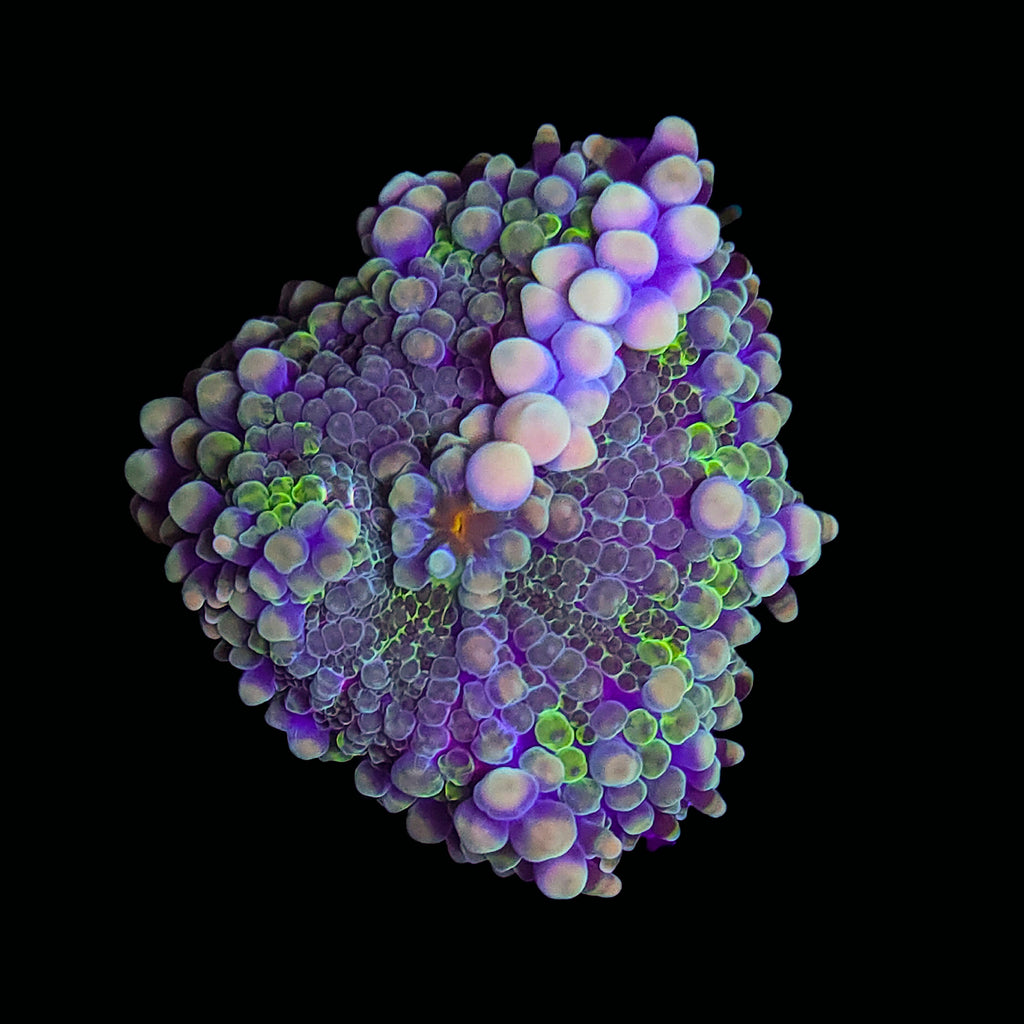 Ricordea yuma, commonly known as the Yuma, is a striking and highly sought-after mushroom coral prized for its vivid coloration and textured polyp structure. Native to the Indo-Pacific, this species is characterized by its bubble-like surface and iridescent hues of orange, pink, green, and blue that shimmer under actinic lighting. Each Yuma displays a unique color pattern, often with contrasting oral discs and tentacle rings, making it a collector’s favorite for both mixed reefs and dedicated mushroom gardens.