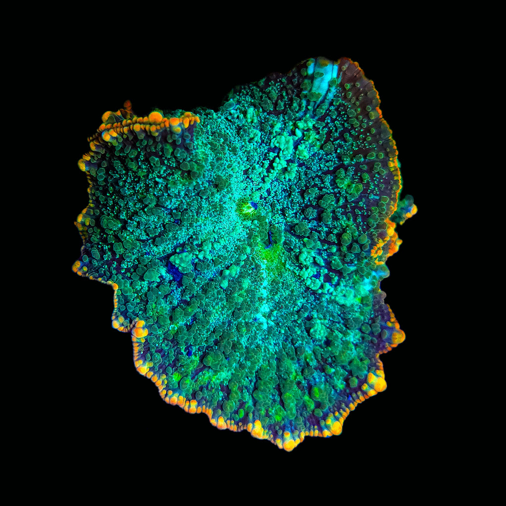 Rhodactis indosinensis, known simply as the Rhodactis or “Hairy Mushroom,” is a large, fleshy corallimorph renowned for its textured surface and bold coloration. Ranging from metallic greens and blues to ultra-premium “bounce” morphs with inflated vesicles, Rhodactis adds movement and depth to reef displays with its dynamic, undulating surface. It thrives in low-flow environments and is among the most adaptable and visually rewarding soft corals, suitable for both entry-level and advanced aquarists.