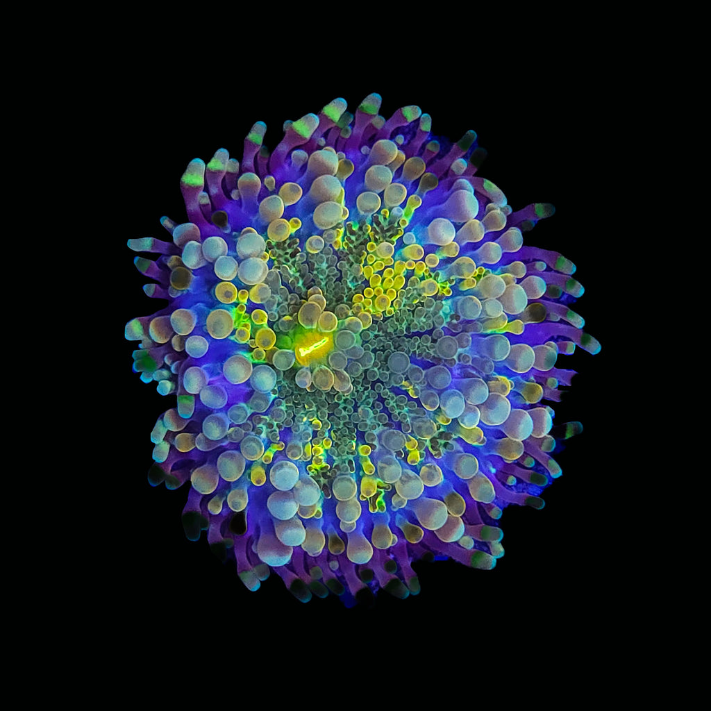 Ricordea yuma, commonly known as the Yuma, is a striking and highly sought-after mushroom coral prized for its vivid coloration and textured polyp structure. Native to the Indo-Pacific, this species is characterized by its bubble-like surface and iridescent hues of orange, pink, green, and blue that shimmer under actinic lighting. Each Yuma displays a unique color pattern, often with contrasting oral discs and tentacle rings, making it a collector’s favorite for both mixed reefs and dedicated mushroom gardens.