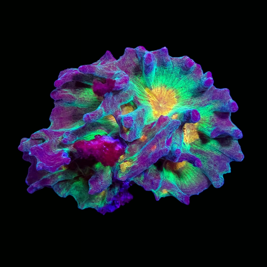 Pectinia alcicornis is a dramatic LPS coral recognized for its ruffled, leaf-like plates and serrated ridges that form sculptural, antlered colonies. Under blue-spectrum lighting, tissues glow in greens, teals, and purples with contrasting ridge tips. At night, it can deploy long sweeper tentacles, so give it elbow room.