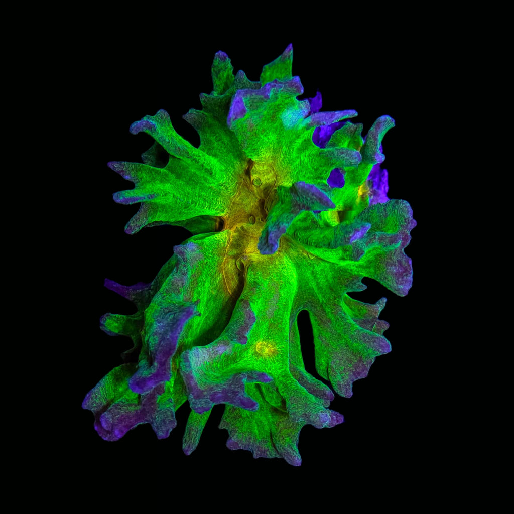 Pectinia alcicornis is a dramatic LPS coral recognized for its ruffled, leaf-like plates and serrated ridges that form sculptural, antlered colonies. Under blue-spectrum lighting, tissues glow in greens, teals, and purples with contrasting ridge tips. At night, it can deploy long sweeper tentacles, so give it elbow room.