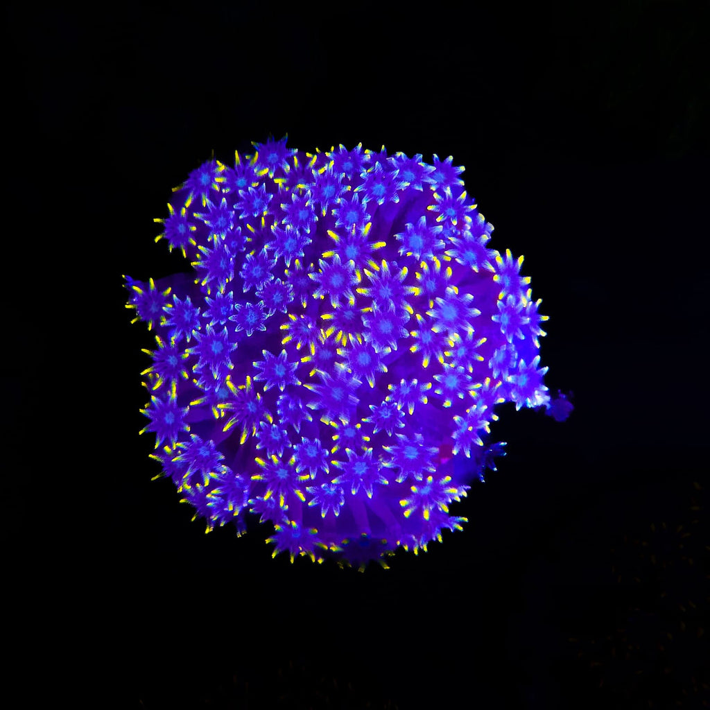 Clavularia spp., known as the Clove Polyps, are graceful, fast-growing soft corals admired for their delicate flower-like appearance and constant motion. Each polyp features a slender stalk topped with feathery tentacles that open and close rhythmically, creating a mesmerizing, waving effect across the reef. Available in a variety of morphs—from metallic greens and purples to ultra-grade neon variants—Clove Polyps provide vibrant color and texture while remaining easy to care for, making them a favorite among reef aquarists of all experience levels.