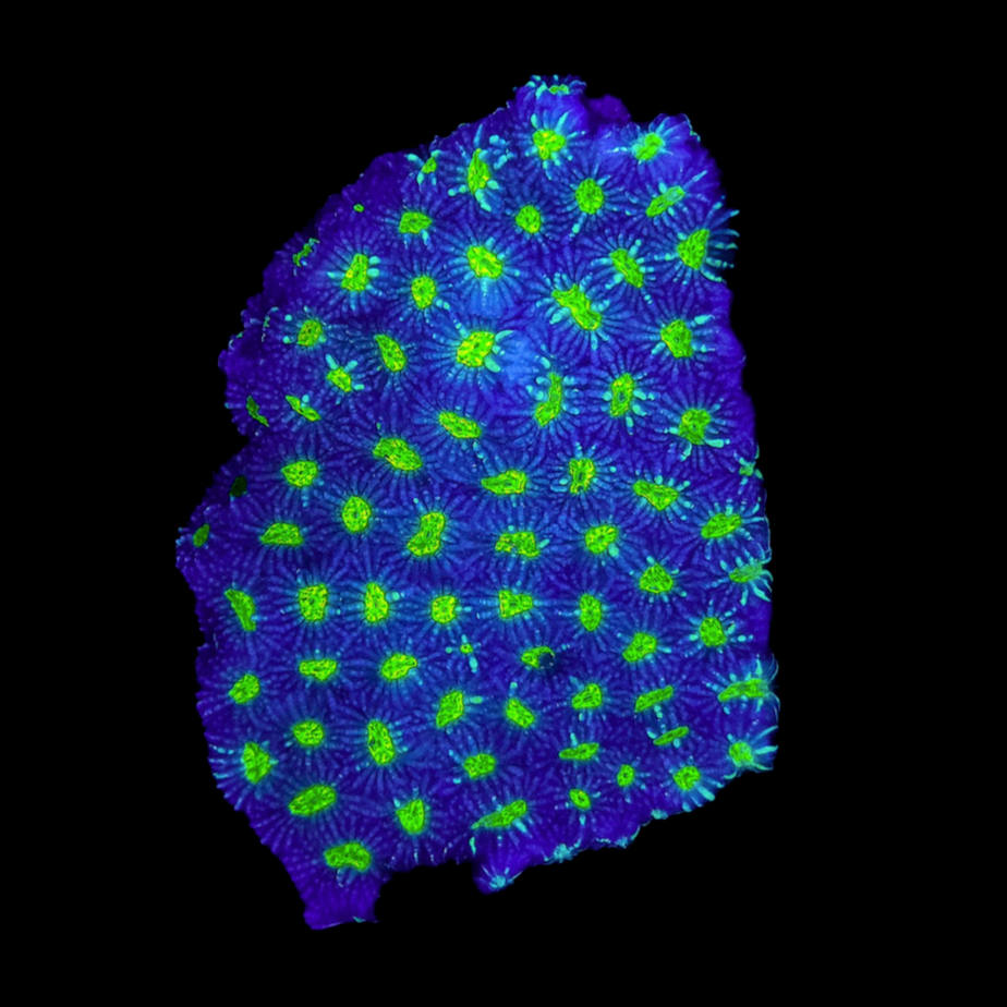 Favia spp., commonly known as Favia or “Closed Brain,” are classic large-polyp stony (LPS) corals recognized for their intricate honeycomb structure and radiant coloration. Each corallite forms a distinct circular pattern, creating a mesmerizing geometric texture across the colony. Found throughout the Indo-Pacific, Favia colonies display rich greens, reds, purples, and metallic highlights under blue-spectrum lighting. Hardy and adaptable, they are an ideal choice for aquarists seeking structure, durability, and color in a mixed reef system.