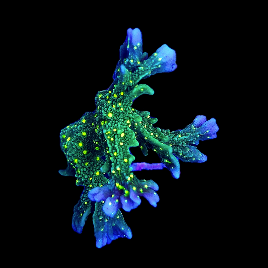 Montipora hirsuta, commonly known as the Hirsuta Montipora, is a visually intricate small-polyp stony (SPS) coral prized for its fine, velvety texture and delicate growth form. Characterized by its “hairy” surface—created by extended polyps that give it a fuzzy appearance—this species exhibits a unique blend of branching and plating growth, often encrusting outward before developing upward, finger-like structures. Coloration varies from rich emerald green and golden brown to rare blue and purple morphs that fluoresce brightly under actinic lighting. When mature, M. hirsuta forms dense, organic colonies that bring both structure and soft motion to SPS-dominated aquariums.