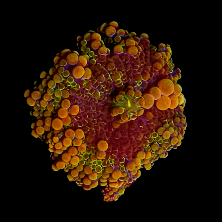 Ricordea yuma, commonly known as the Yuma, is a striking and highly sought-after mushroom coral prized for its vivid coloration and textured polyp structure. Native to the Indo-Pacific, this species is characterized by its bubble-like surface and iridescent hues of orange, pink, green, and blue that shimmer under actinic lighting. Each Yuma displays a unique color pattern, often with contrasting oral discs and tentacle rings, making it a collector’s favorite for both mixed reefs and dedicated mushroom gardens.