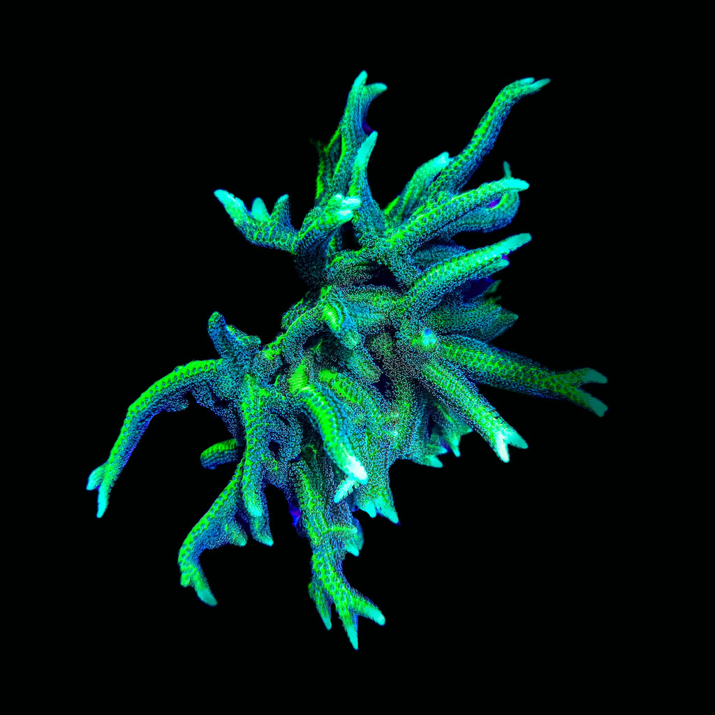 Seriatopora hystrix, commonly known as the Birdsnest Coral, is a fast-growing small-polyp stony (SPS) coral recognized for its fine, delicate branching structure and intense coloration. Available in hues ranging from neon green and pink to the highly sought-after orange and purple morphs, S. hystrix creates intricate, tree-like colonies that provide exceptional texture and movement to SPS reef aquariums. Its slender branches and glowing polyps make it a cornerstone species for aquarists seeking vibrant color and dynamic form.