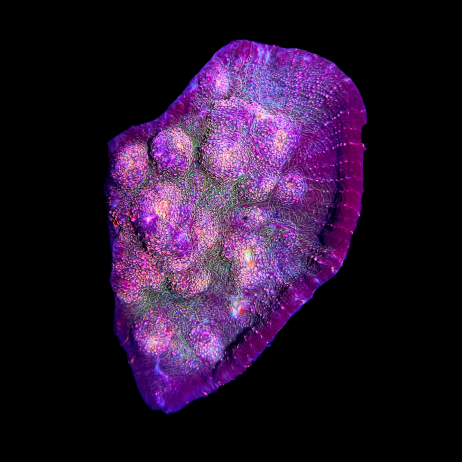 The Chalice Coral is a collective name for several closely related LPS genera, including Echinophyllia, Oxypora, and Mycedium. Renowned for their vivid, often iridescent coloration and dramatic growth forms, Chalice corals are among the most visually striking additions to reef aquariums. Their surfaces display intricate ridges, eyes, and swirling patterns in colors ranging from neon green and hot pink to rainbow blends. Found on shaded reef slopes and overhangs, these corals thrive under gentle flow and subdued lighting, where their fluorescence and contrast truly come alive.