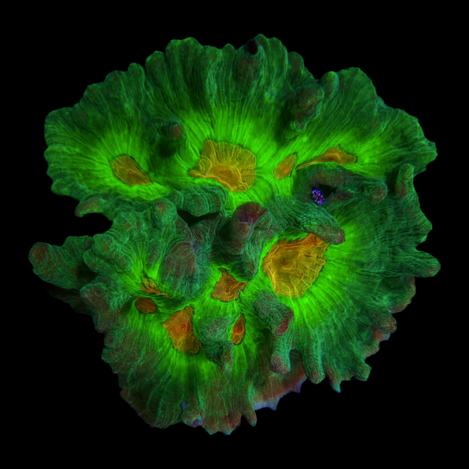 Pectinia alcicornis, commonly known as the Space Invader, is one of the most striking and recognizable chalice-type LPS corals in the reefing world. Characterized by its vivid neon-green tissue contrasted with glowing yellow eyes and deep purple skeletal ridges, this coral’s architecture is as dramatic as its color. The elongated, antler-like ridges and undulating valleys give it a sculptural appearance, while its intense fluorescence under blue-spectrum lighting makes it an unmistakable centerpiece in any reef display.