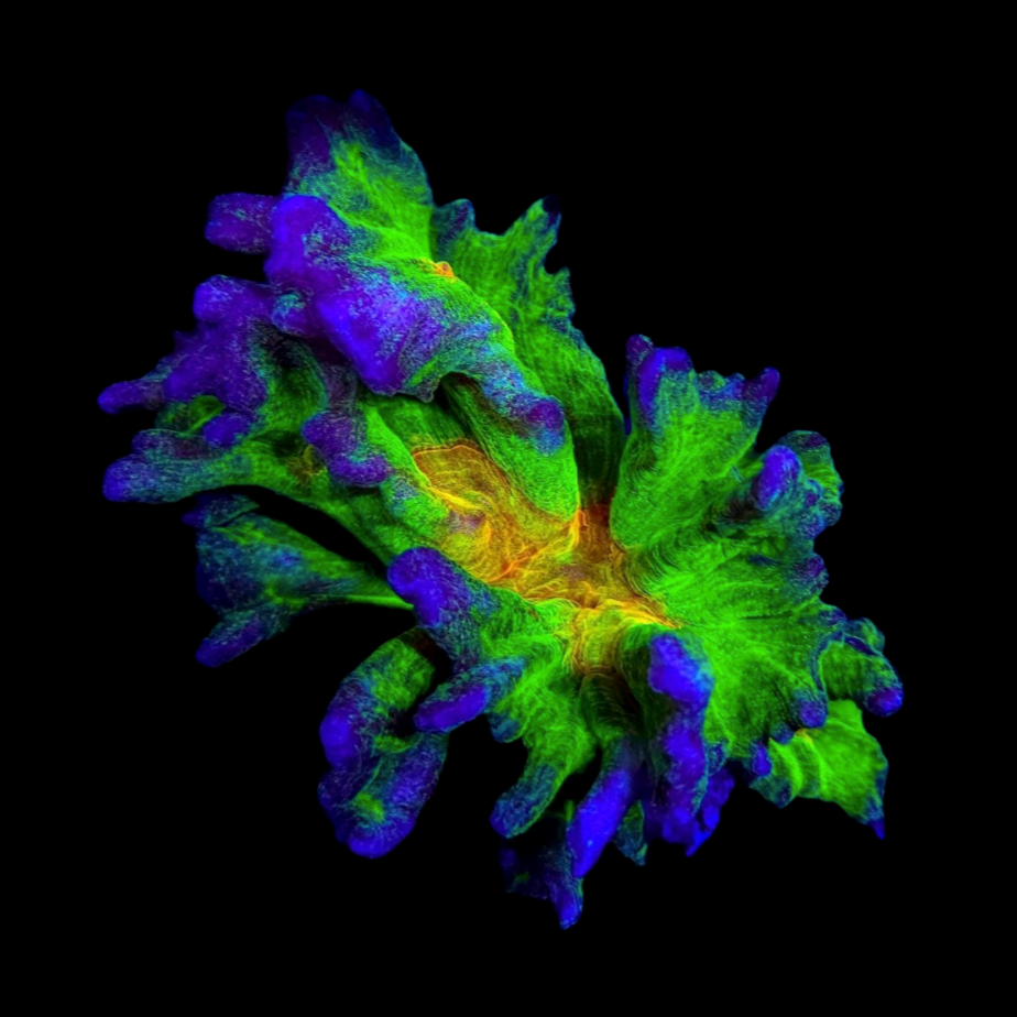 Pectinia alcicornis, commonly known as the Space Invader, is one of the most striking and recognizable chalice-type LPS corals in the reefing world. Characterized by its vivid neon-green tissue contrasted with glowing yellow eyes and deep purple skeletal ridges, this coral’s architecture is as dramatic as its color. The elongated, antler-like ridges and undulating valleys give it a sculptural appearance, while its intense fluorescence under blue-spectrum lighting makes it an unmistakable centerpiece in any reef display.
