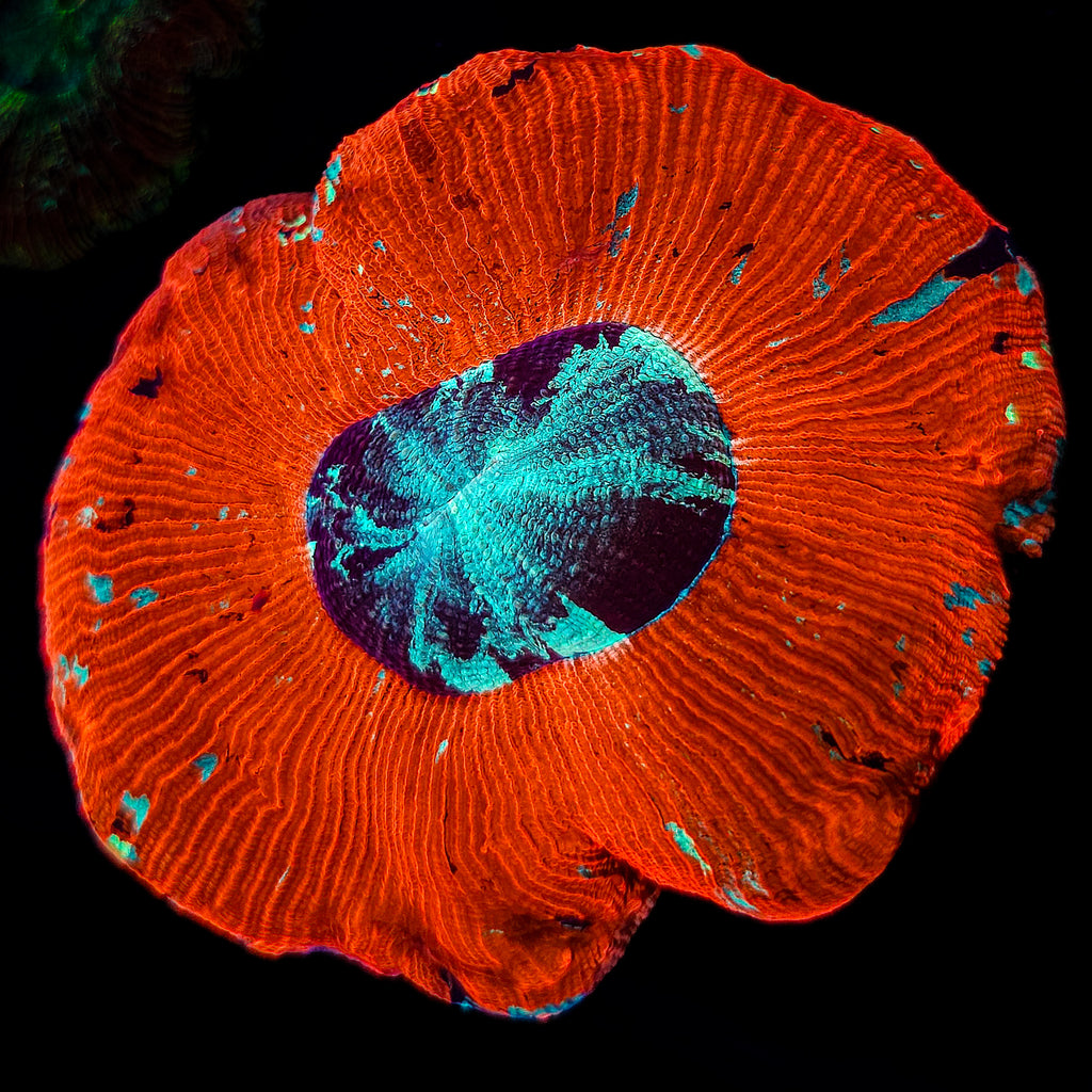 Trachyphyllia geoffroyi, commonly known as the Trachyphyllia or “Open Brain,” is a classic large-polyp stony (LPS) coral revered for its striking color combinations and fleshy, lobed structure. Found in lagoonal sand flats and lower reef slopes, it displays brilliant metallic hues—ranging from neon green and crimson to rainbow patterns that shimmer under blue-spectrum lighting. Its gentle pulsation and soft expansion make it a centerpiece coral in many reef aquariums, where it thrives under moderate light and flow.