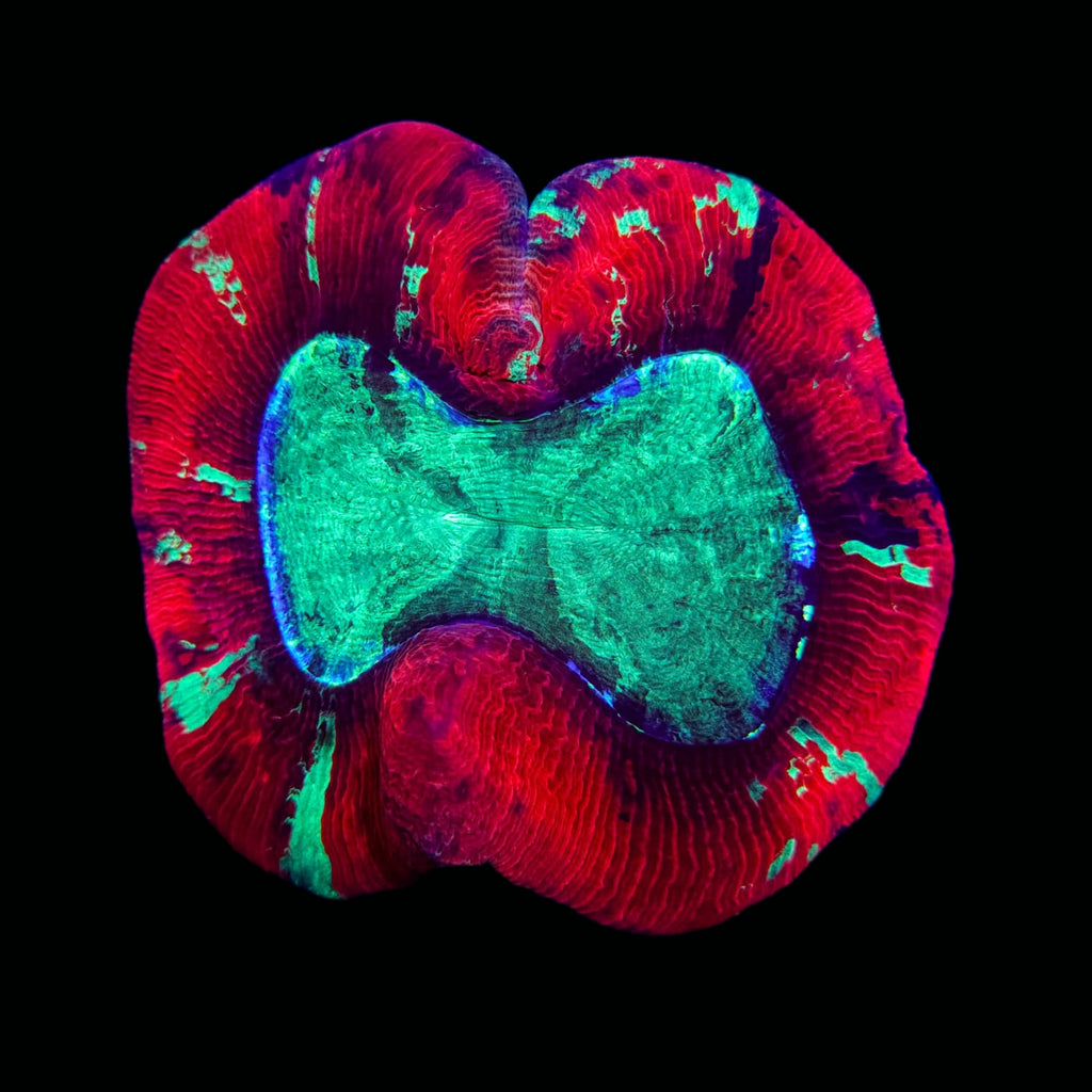 Trachyphyllia geoffroyi, commonly known as the Trachyphyllia or “Open Brain,” is a classic large-polyp stony (LPS) coral revered for its striking color combinations and fleshy, lobed structure. Found in lagoonal sand flats and lower reef slopes, it displays brilliant metallic hues—ranging from neon green and crimson to rainbow patterns that shimmer under blue-spectrum lighting. Its gentle pulsation and soft expansion make it a centerpiece coral in many reef aquariums, where it thrives under moderate light and flow.