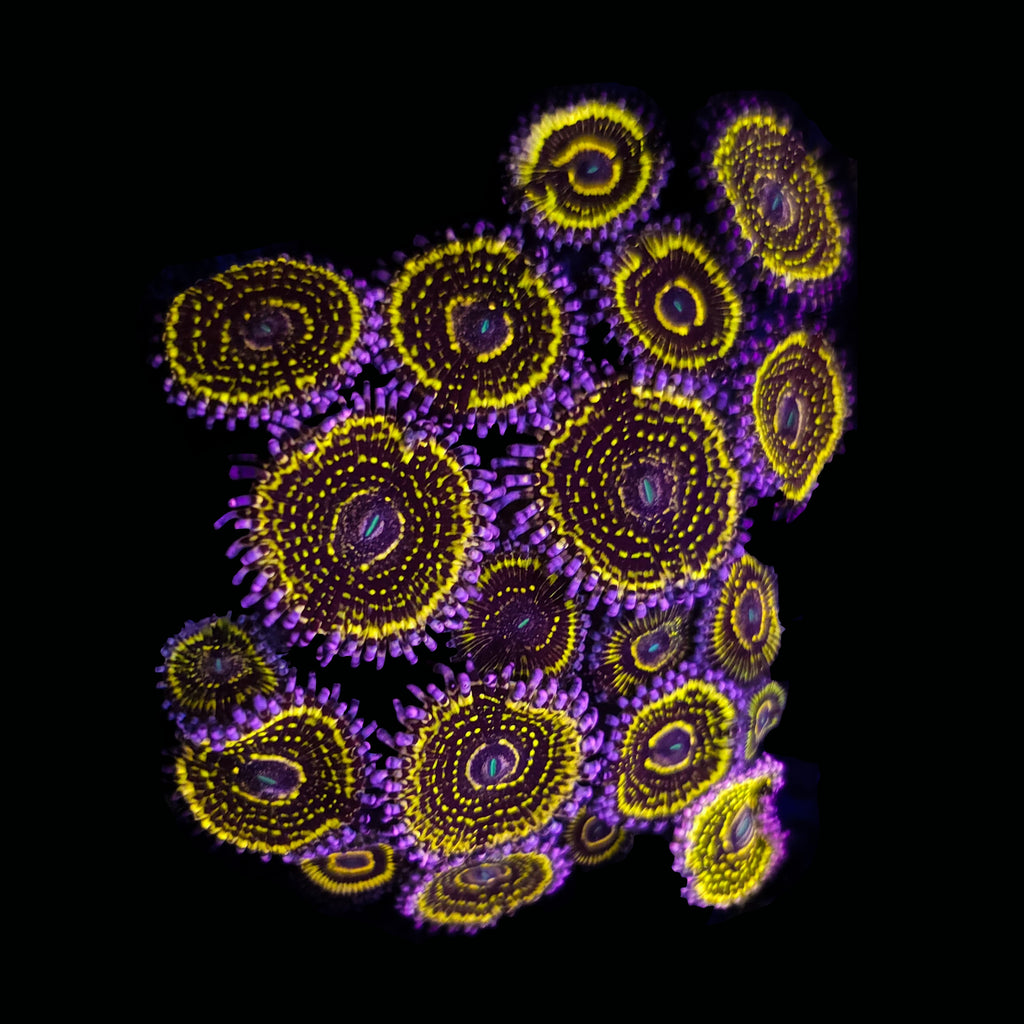 Stratosphere Zoanthids are a true collector-grade morph revered for their unmistakable high-contrast patterning and elite-tier presentation. Each polyp displays a deep, inky black to dark plum face layered with intricate neon yellow radial striping and dotted inner speckling, creating a bold concentric target effect. A vivid turquoise to electric teal mouth anchors the center, while a rich violet-purple skirt frames the disc with dramatic contrast. Under blue-spectrum lighting, the fluorescence intensifies sharply—crisp, saturated, and immediately recognizable even among premium zoanthid collections.