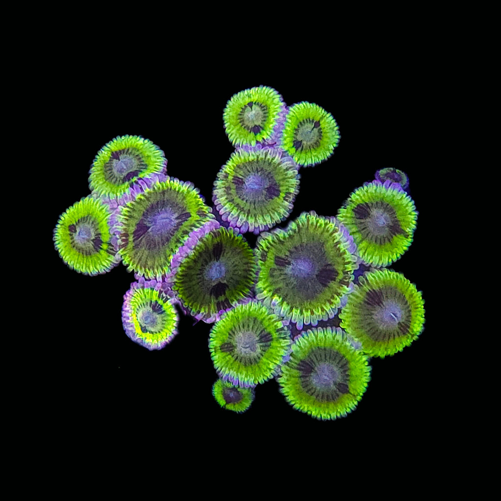 Zoanthus spp., known collectively as the Zoanthids or “Zoas,” are among the most colorful and diverse soft corals in the reef aquarium hobby. Each polyp resembles a miniature flower, displaying an endless array of color combinations—from radiant neons and deep metallics to ultra-rare morphs like Rainbow Incinerators, Utter Chaos, and Rastas. Highly adaptive and visually striking, Zoanthids can form dense mats that blanket rockwork with vibrant color, making them a staple in both beginner and collector-level reef aquariums. Their resilience, growth rate, and breathtaking variety make them one of the most rewarding coral groups to cultivate.